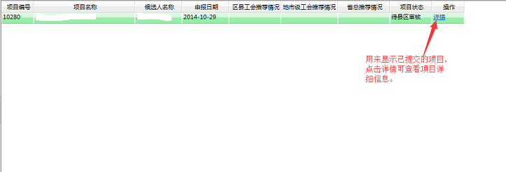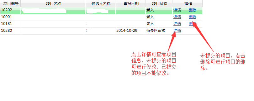 进入“详细项目信息”界面,可查看“录入或已上报的项目清单”,点击“详细”可查看详细项目信息,未上报的项目点击“删除”可删除项目信息。附图如下: