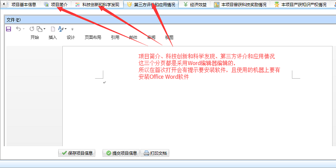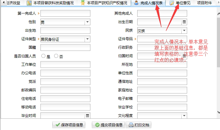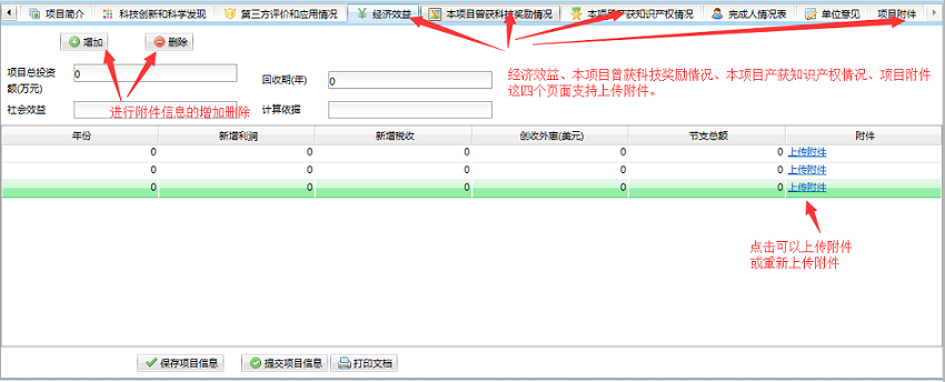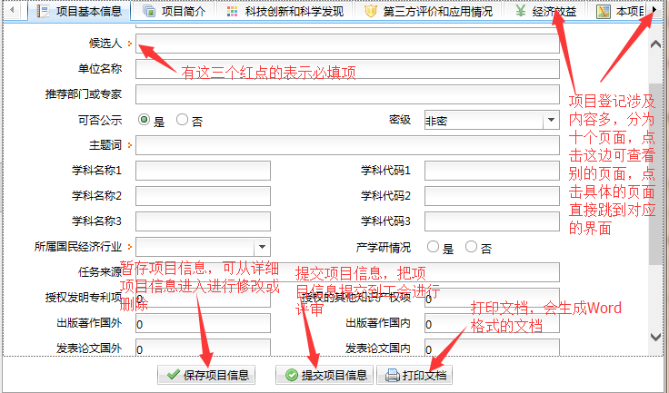 进入“项目登记”界面,可进行“项目基本信息、项目简介、科技创新和科学发现、第三方评价和应用情况、经济效益、本项目曾获科技奖励情况、本项目产奖知识产权情况、完成人信息”的填写,点击“保存项目信息”按钮,可进行项目信息的暂存,后期可进行修改,点击“提交项目信息”按钮进行申报项目资料的提交。附图如下: